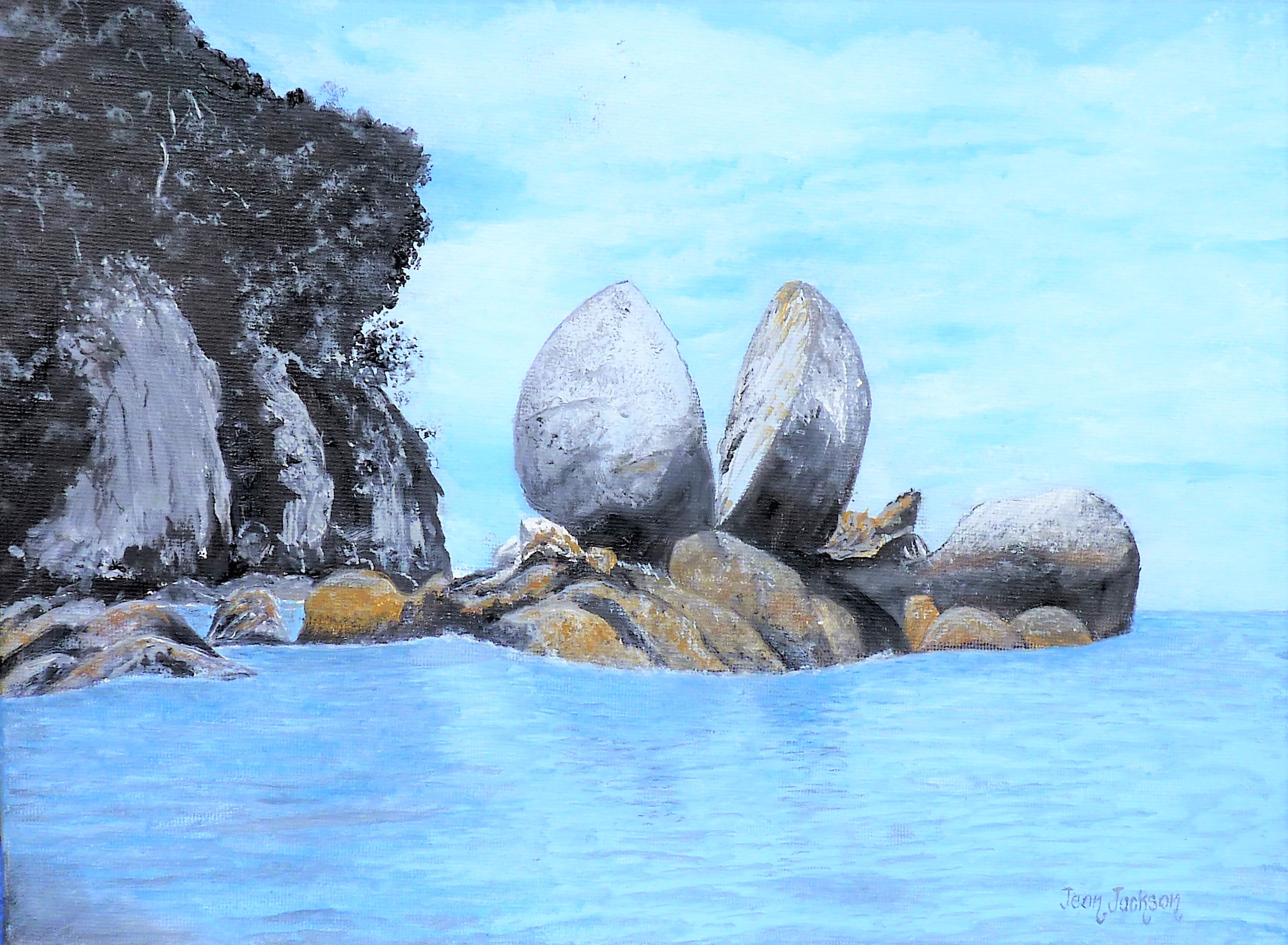 Previous Image Next Image Split Apple Rock, Abel Tasman NP Split Apple Rock, Abel Tasman NP Oil on Canvas 30cmW X 23cm H SOLD Like Loading...